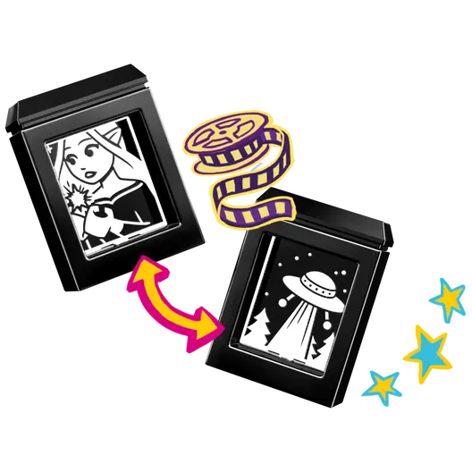 It’s “lights, camera, friendship!” as kids tell the story of friends Paisley and Aliya, who are enjoying a movie night in Paisley’s garden. Slot a movie slide into the projector and press the light brick to make the image appear on the big screen. Discover lots of accessories, including a popcorn machine with a lever to make the popcorn ’pop’! Other accessories include a popcorn box, drinks, a comic book and 2 comfy chairs.