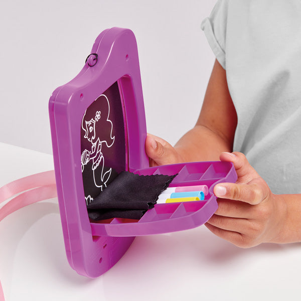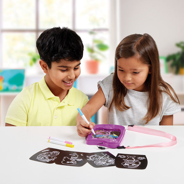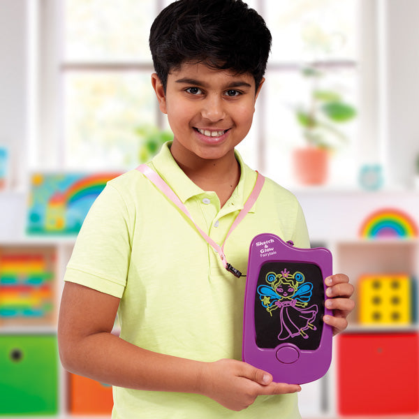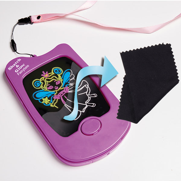 Hours of fun with this unique fairytale sketch and glow set! Simply insert a trace card of your choice and start creating with the coloured pens provided. The handy lanyard makes this perfect for on-the-go creations. A multi-coloured light effect will bring your designs to life! Simply use the cloth to wipe the pad clean and start again!